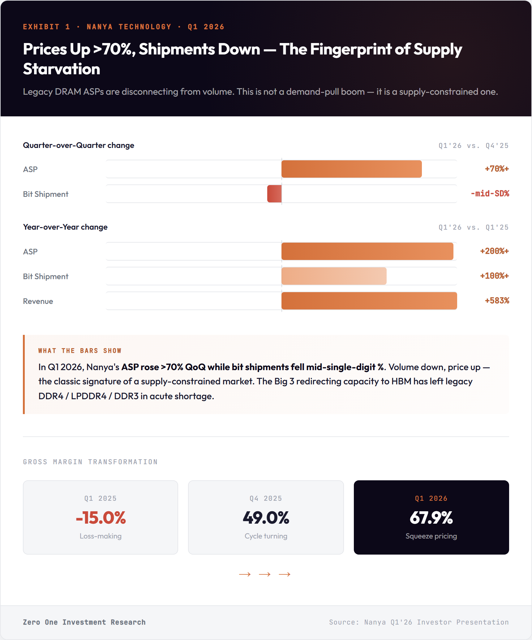 - ●The underlying signal is not HBM. Nanya is a legacy DRAM house (DDR4 / LPDDR4 / DDR3), with DDR5 at only 10% of revenue. Q1 ASPs rose >70% QoQ and >200% YoY while bit shipments actually fell mid-single-digit percent QoQ — pure supply-constrained pricing.