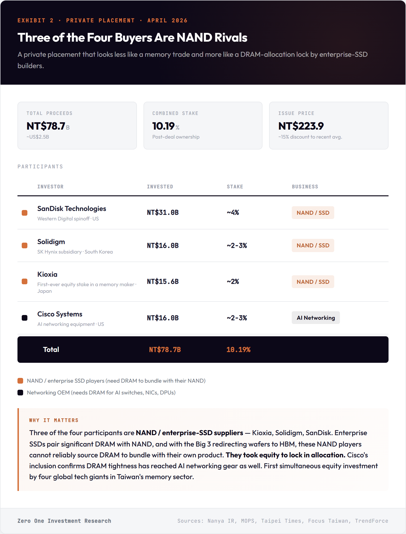 - ●The NT$78.72B private placement that closed April 8, 2026 now has named participants: SanDisk (~4%), Solidigm / SK Hynix (~2-3%), Kioxia (~2%), and Cisco (~2-3%) — collectively 10.19% of Nanya post-deal. Three of the four are NAND / SSD players. This is reportedly Kioxia's first-ever equity investment in a memory manufacturer, and the first simultaneous equity investment by four global tech giants in Taiwan's memory sector.